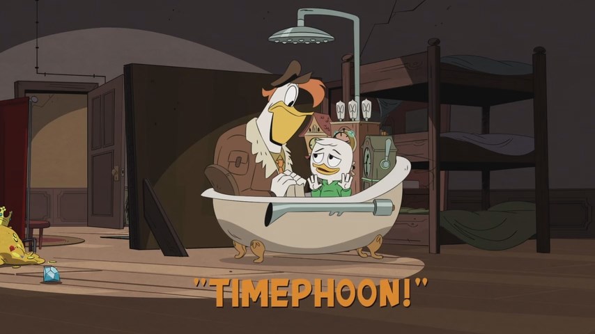 While preparing the manor for a hurricane, Beakley confronts Della about her lack of strictness. Meanwhile, Louie’s latest scheme, treasure hunting through time with Gyro’s Time Tub, goes horribly wrong when it turns said hurricane into a “timephoon”, bringing people from the past to the present. In an attempt to stop it, Louie returns the treasures, but it fails and he is caught by Della. Things then go from bad to worse as each family member is sent to a different time period, leaving only Louie. In the end, with help from a caveduck named Bubba, Louie returns the time-displaced people and everyone comes back. However, while the others forgive Louie, Della grounds him for his actions. Afterward, Huey ponders if Bubba might have been a Clan McDuck ancestor.